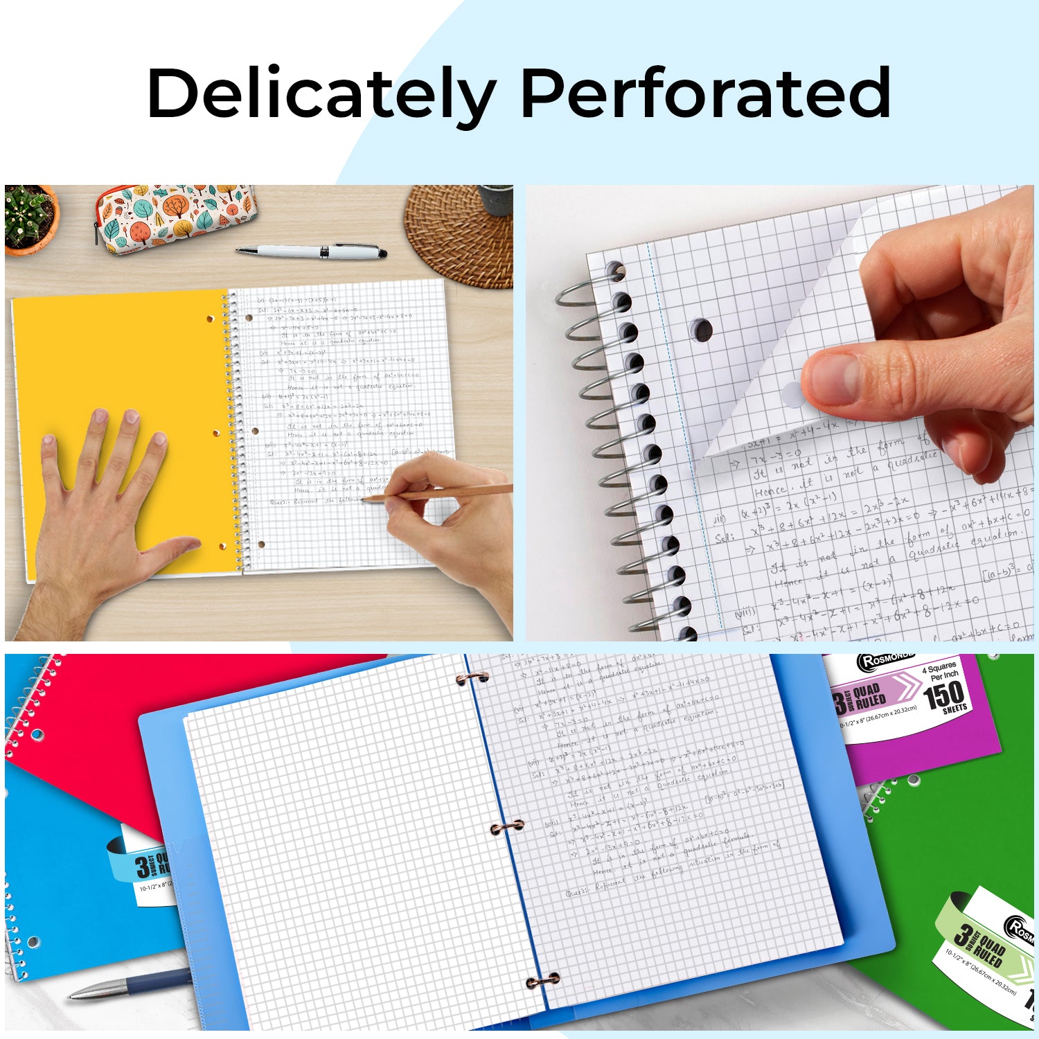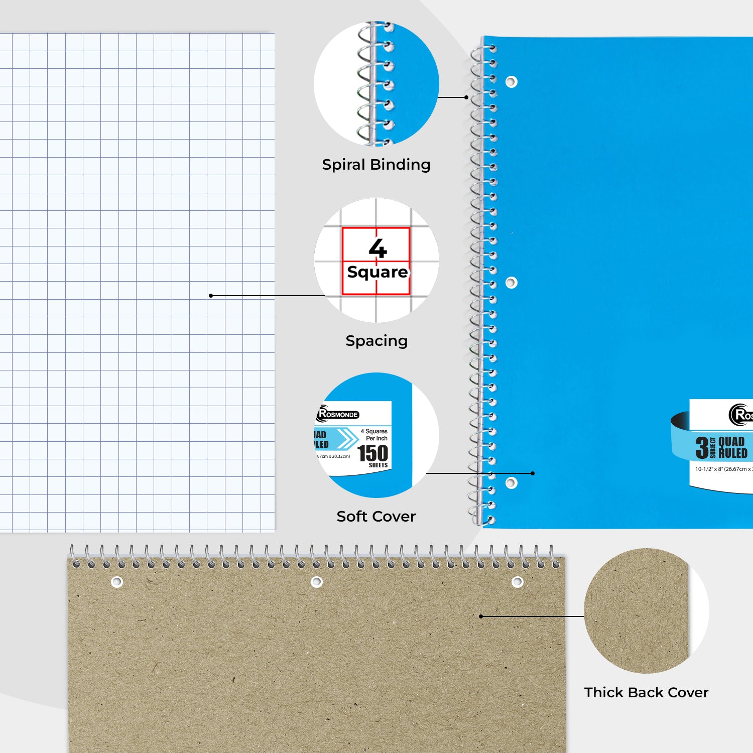 Features: Bulk Spiral 3 Subject Notebook Quad Ruled, 150 Sheets, 300 Pages, 8 x 10-½
