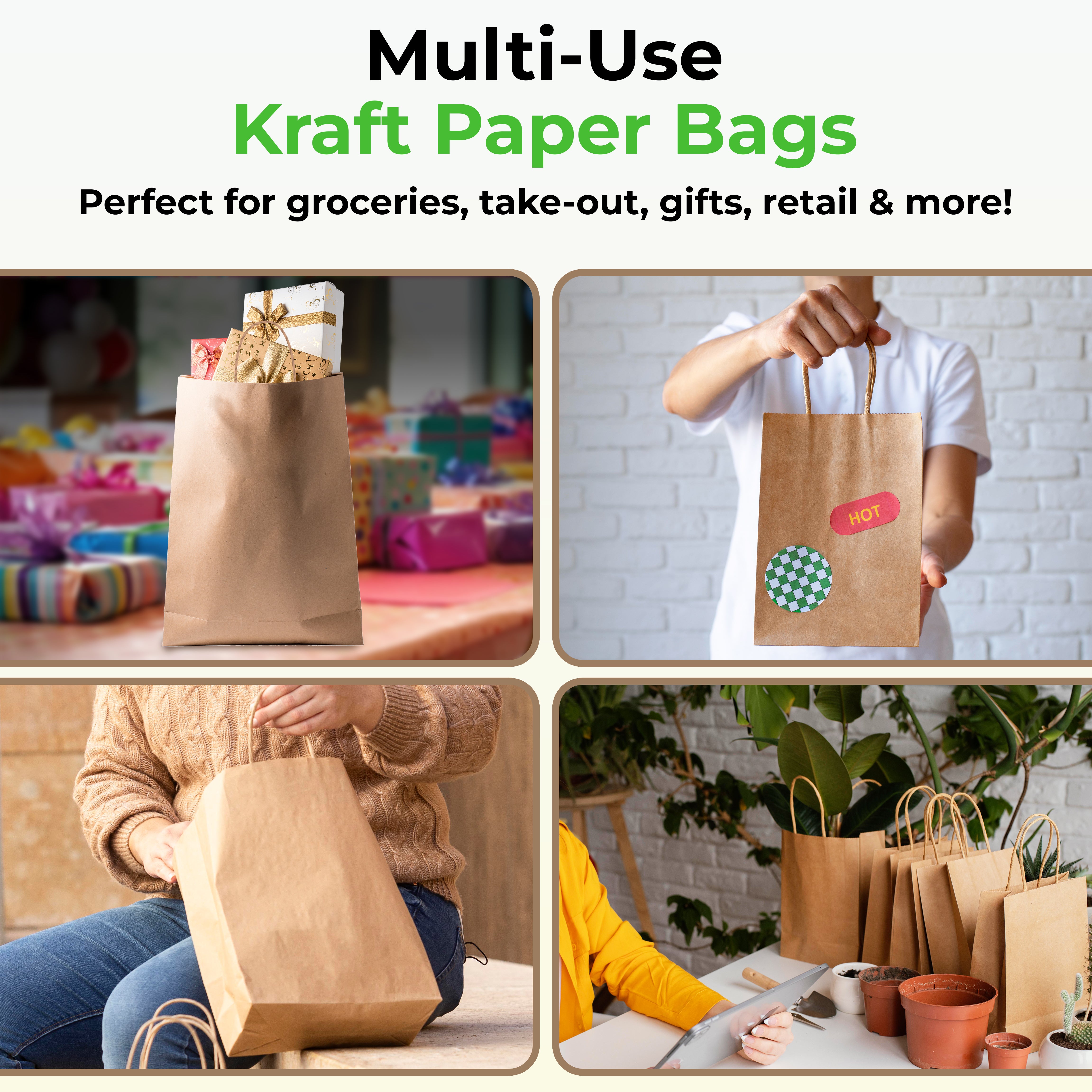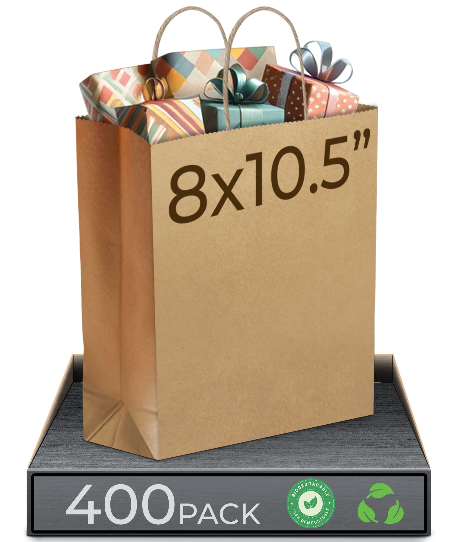 Feautures: Bulk Pack Kraft Paper Bag, 8" x 4.75" x 10.5" Tote Style Handle Natural Brown.
